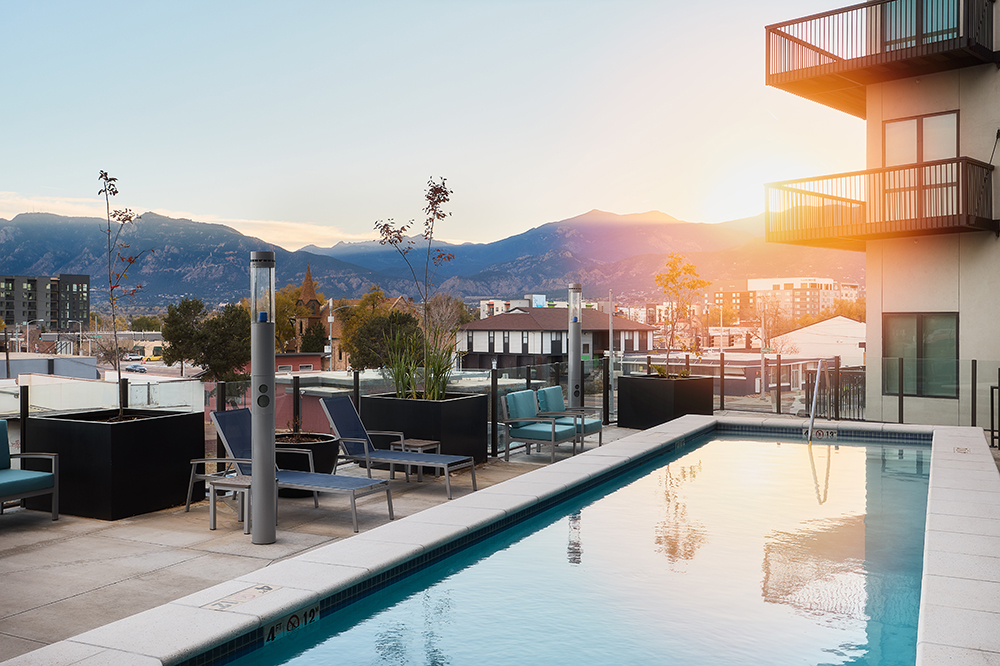 VIM offers a full suite of modern amenities designed to enhance your lifestyle in downtown Colorado Springs. Highlights include a resort-style pool, rooftop deck with a hot tub and fire pit, co-working spaces with private offices, a second-floor courtyard, and a rooftop clubhouse. Additional perks include a fitness center, yoga room, secure mailroom, and dog wash station. Amenity spaces are accessible to residents from 10am to 10pm, 7 days a week, unless otherwise noted.